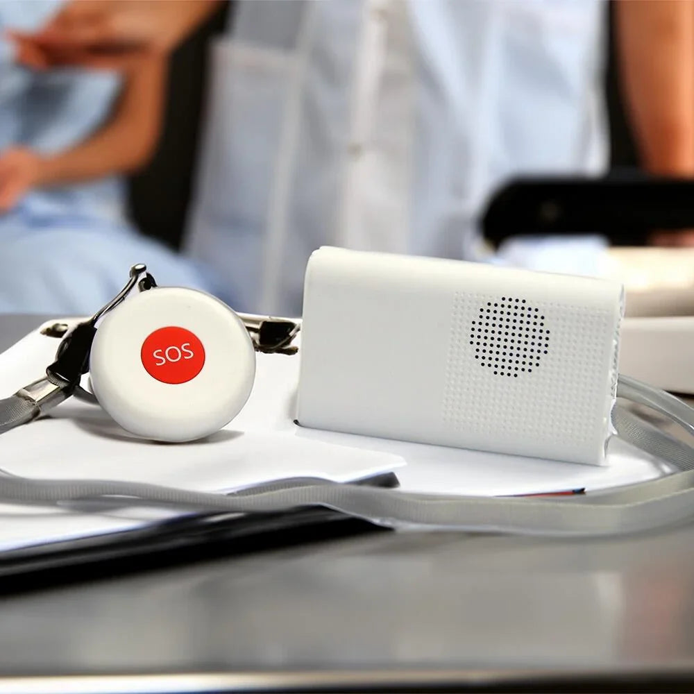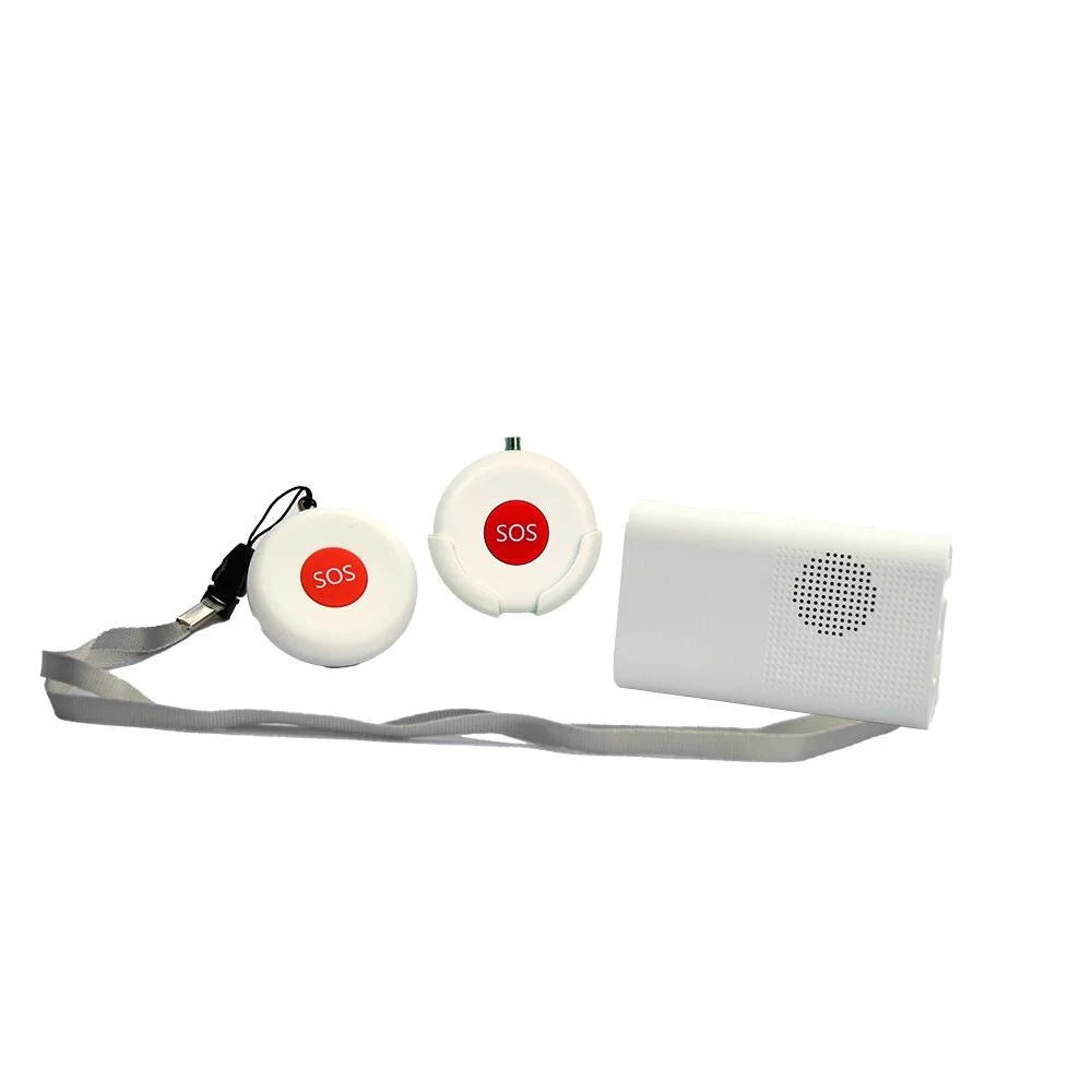 This wireless alarm system includes 2 user-friendly call buttons that trigger a portable pager with audio, vibration, and visual notifications. Each pendant can be programmed with a unique tone to identify the caller and can connect to multiple pagers. The USB rechargeable pager, with a low battery warning, offers up to 3 months of standby time and supports additional pendants. Key features include wireless setup with a 100m range, three volume settings up to 105dB, and two pendants complete with lanyards and mounting brackets. The compact pager (90x55x20mm) comes with a belt clip and optional stand or mounting bracket